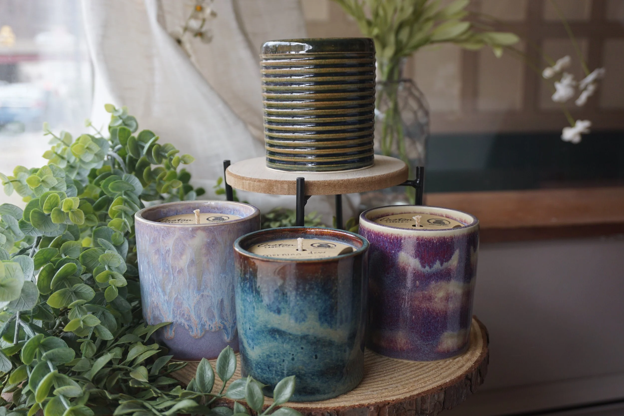 Score a one-of-a-kind handmade ceramic vessel from local artists Earthen Goat, filled with a custom candle that keeps on giving! Once you've burned through the candle, clean it out for a cute planter or cup, or bring it back to refill with your next favorite scent.